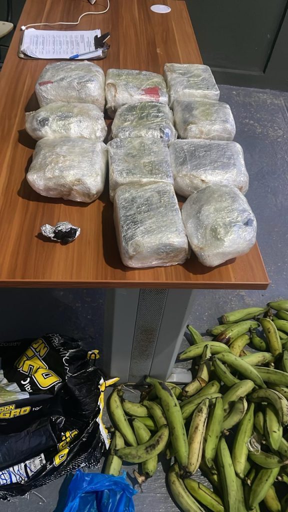 En la intervención, las autoridades detuvieron al conductor de un minibús y a su acompañante. Tras la revisión del maletero del vehículo, los agentes localizaron un saco que contenía plátanos, dentro del cual estaban ocultos los paquetes envueltos en papel de aluminio. Además de las pacas, se ocupó una porción adicional de 13.4 gramos del mismo vegetal.