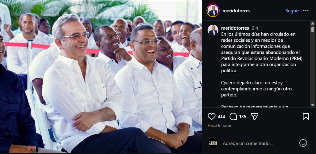 El dirigente del Partido Revolucionario Moderno (PRM), Mérido Torres, negó de manera categórica las versiones que han circulado recientemente sobre su supuesta renuncia a las filas de la organización oficialista. A través de una declaración pública difundida en su cuenta oficial de la red social X, el político desmintió de forma enfática que esté considerando abandonar el partido para integrarse a otra entidad política.
