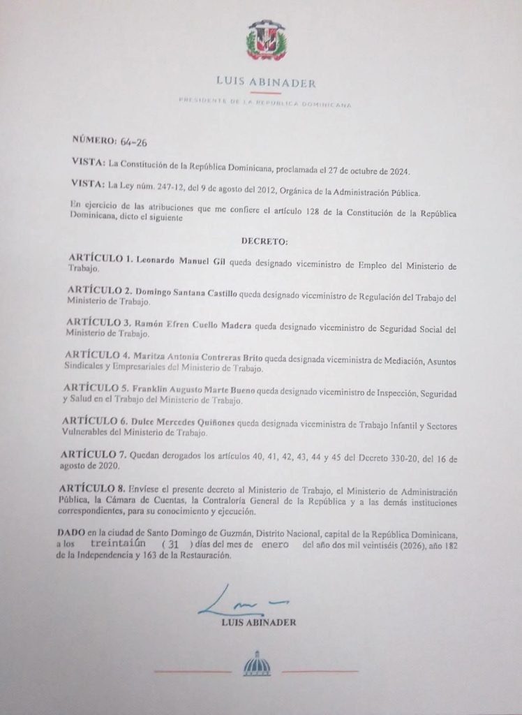 Santo Domingo, Rep. Dominicana | 17 de febrero de 2026.– En uso de sus facultades constitucionales, el presidente Luis Abinader emitió el Decreto número 64-26, a través del cual designa a nuevos funcionarios en posiciones clave del Ministerio de Trabajo. Esta medida busca dinamizar las distintas áreas de la institución, desde la generación de empleos hasta la inspección y seguridad social.